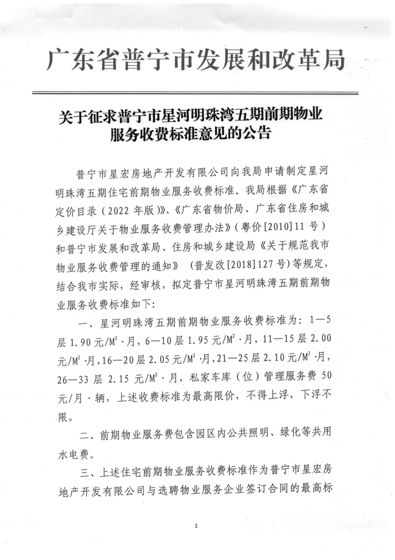 近日,普宁市发展和改革局发布了关于征求普宁市星河明珠湾五期(楼盘详情户型图相册地图0663-2559559)前期物业服务收费标准意见的公告,具体内容如下: