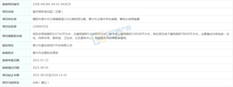 据了解,星河明珠湾五期于2021年8月备案通过,总投资23亿,项目总用地面积103742平方米,总建筑面积316500平方米,其中地上建筑面积238500平方米,架空层及地下建筑面积78000平方米。主要建设内容包括:住宅、肉菜市场、警务室、卫生站、社区服务中心、物业服务用房等配套建筑。