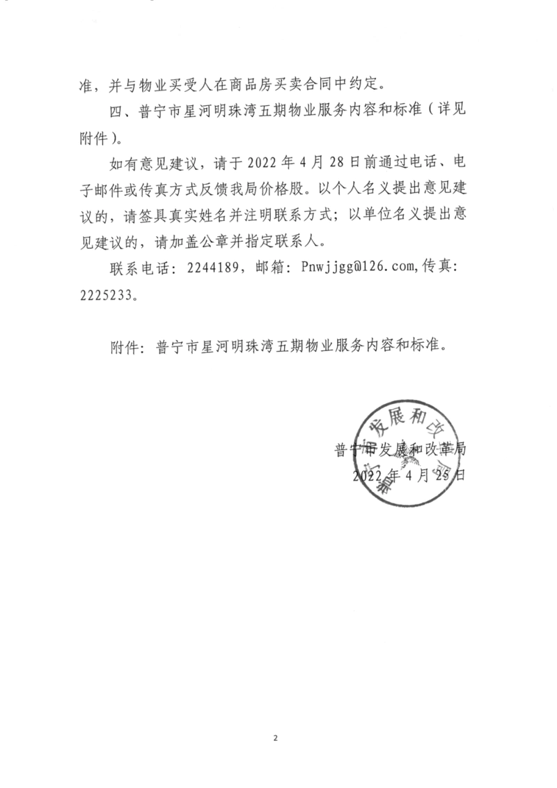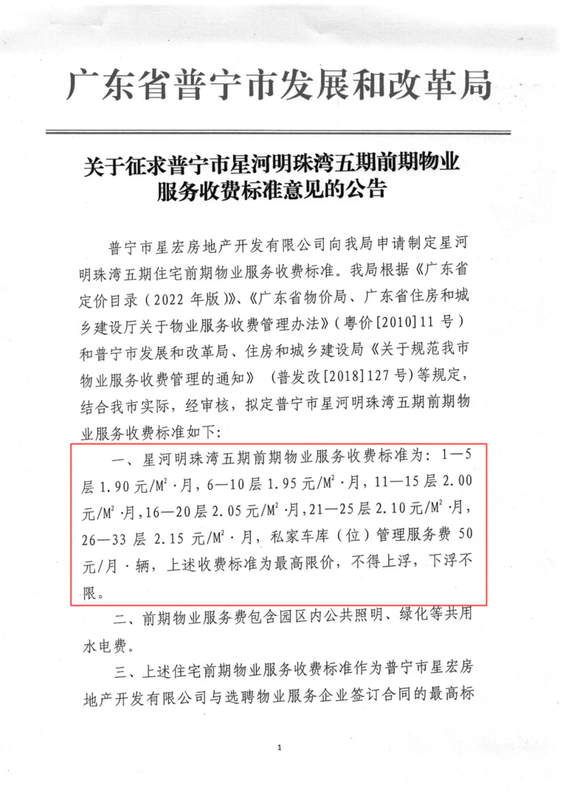 4月底,星河明珠湾五期前期物业服务收费标准对外征求意见。(相关链接:征求意见!普宁市星河明珠湾五期前期物业服务收费标准公告!)