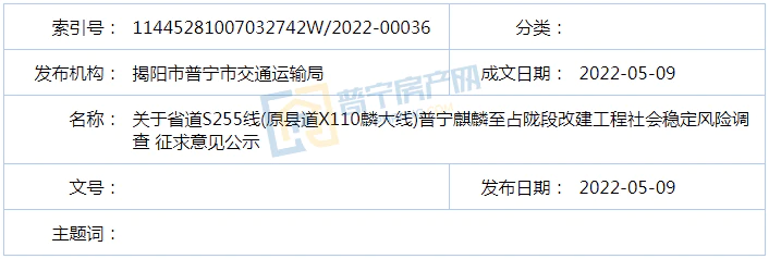 关于省道S255线(原县道X110麟大线)普宁麒麟至占陇段改建工程社会稳定风险调查征求意见公示