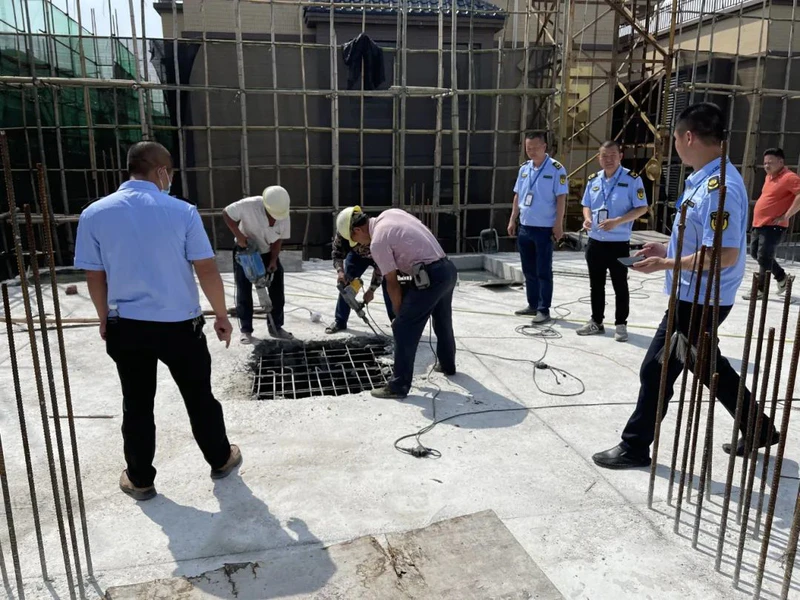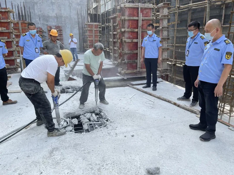 本次行动共组织执法人员50多人,出动风炮和切割机等机械,依法依规对乌石村洪厝乡的一宗违法建设超建部分予以拆除,拆除面积约392平方米。