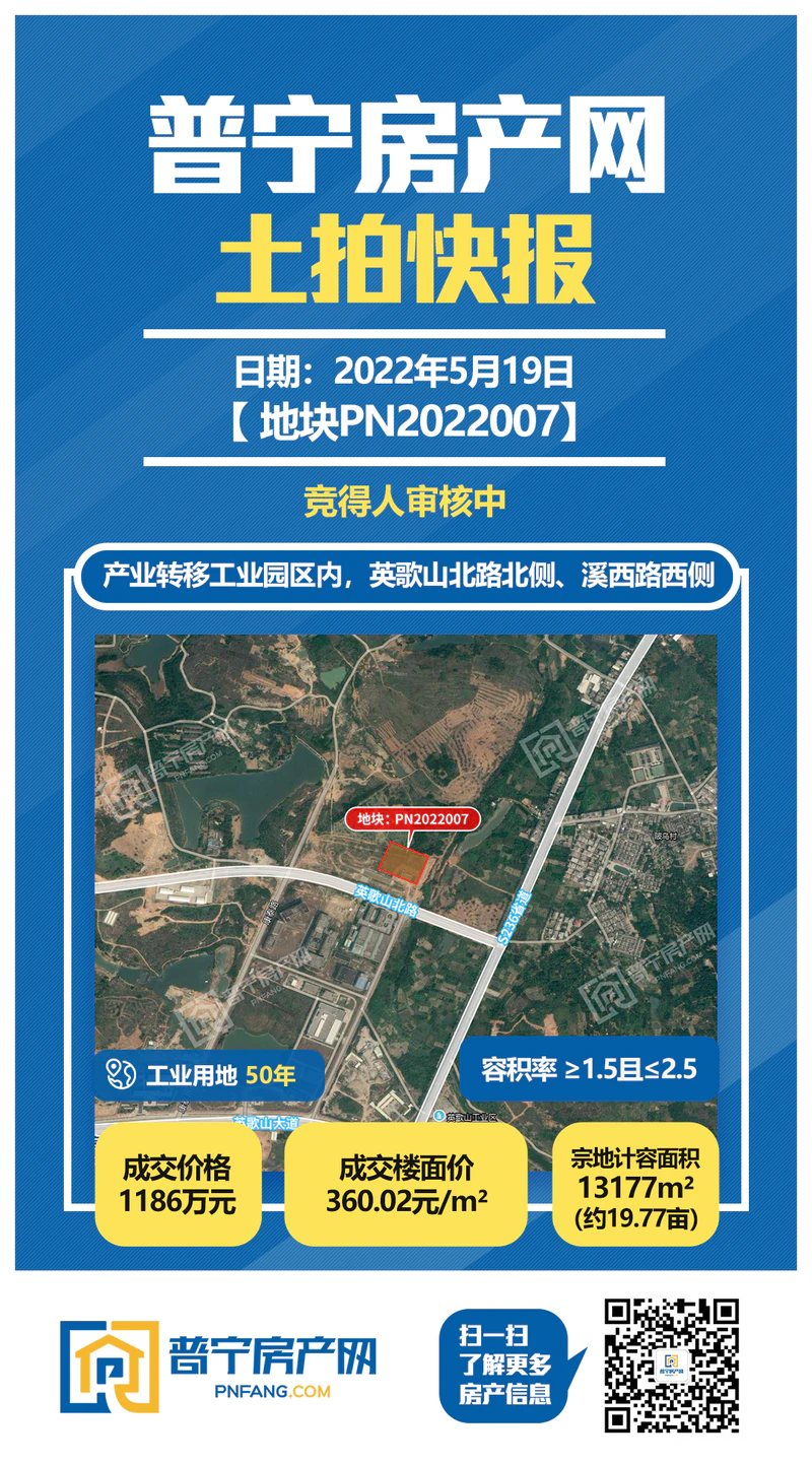 PN2022007地块以1186万成交,成交楼面价360.02元/㎡,地块位于产业转移工业园区内,英歌山北路北侧、溪西路西侧,占地面积13177平方米,为50年工业用地。
