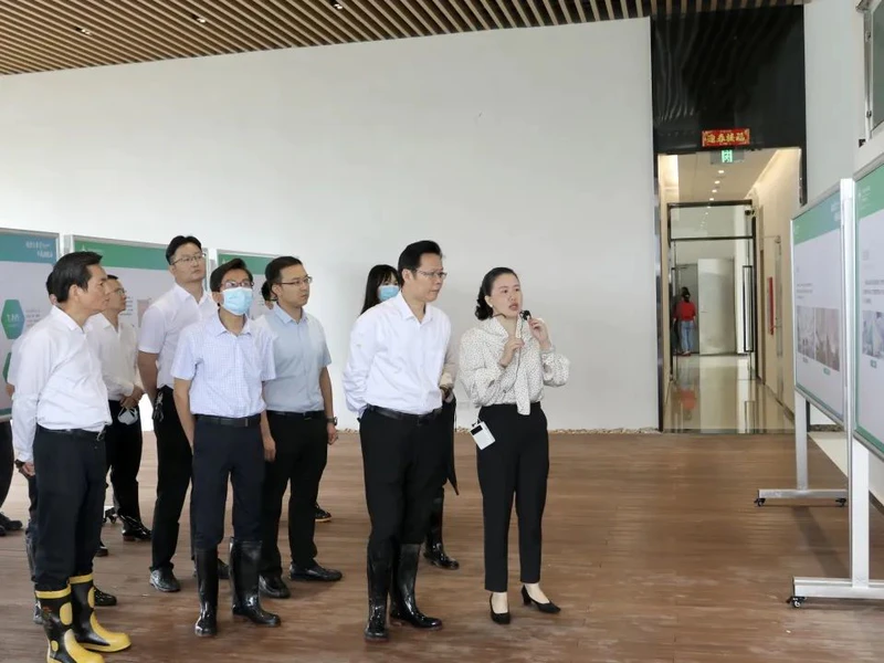 随后,黄锐亮还实地调研普宁市水质净化厂,听取了解普宁练江生态文明展览馆的初步设计构思,提出要结合周边河道、农田等生态景观,连片打造、提升村庄环境的理念,并鼓励有关设计人员深入调研、拓宽视野,以习近平生态文明思想在普宁治污的生动实践为主题,切实将普宁练江生态文明展览馆打造成集地域性、实践性、教育性、互动性为一体的科普场所,让老百姓真正感受、享受生态文明建设带来的实在成效。
