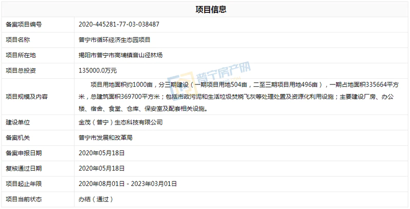 普宁市循环经济生态园项目已列入2021年省重点建设项目名单,也是普宁“十四五”规划重点项目,采用BOO模式,服务年限为30年。项目总投资13.5亿,已于2020年5月备案通过,一期占地面积335664平方米,主要建设厂房、办公楼、宿舍、食堂、仓库、保安室及配套相关设施。