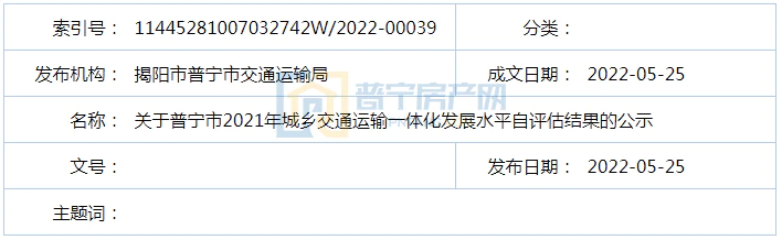 近日,普宁市交通运输局发布了关于普宁市2021年城乡交通运输一体化发展水平自评估结果的公示,总得分为75.39分,评价等级为AAA级。具体内容如下: