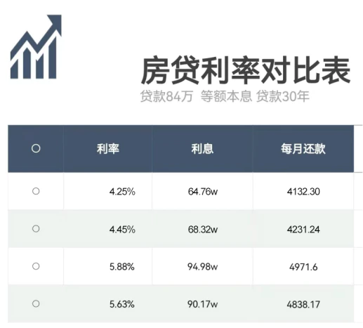 降低利率也是刺激楼市的一种手段,因为大家的买房成本降低了,可能会有人觉得,不就降低了几个点,能有多大差别,那究竟到底有多少,今天就给大家算算。假设一套房总房款是120W,首付3成36万,贷款84万等额本息计算,以普宁目前5.88%的利率计算,月供是4971.6元;如果以目前最低4.25%的利率计算,月供是4132.3元。看完之后是不是觉得工资的涨幅依旧赶不上月供下降的速度。或许也有眼尖的小伙伴发现,利率最后有一个5.63的,这也是近期准备办理按揭的热心网友给我们分享的一个利率数据。这里再给大家科普一下房贷的计算公式,一个简单的公式就能明白。房贷计算公式: