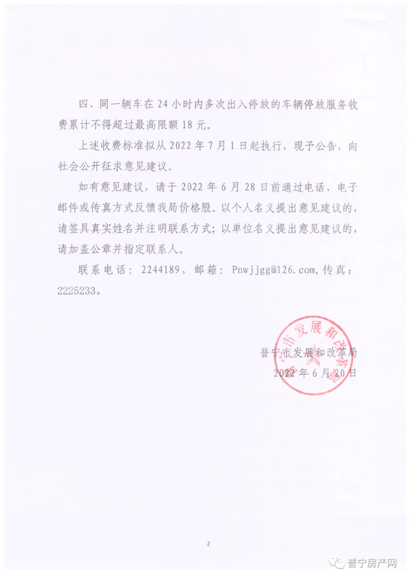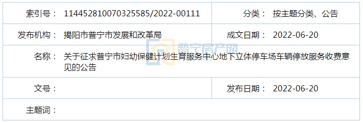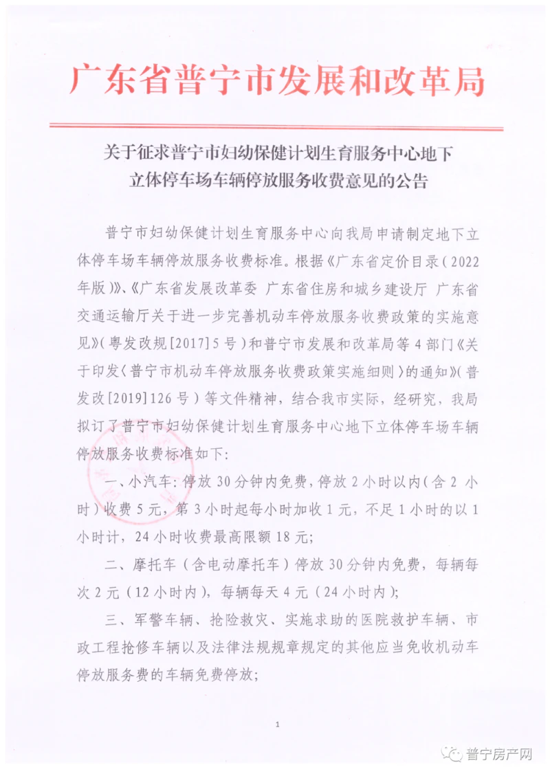 今天,普宁市发展和改革局发布了关于征求普宁市妇幼保健计划生育服务中心地下立体停车场车辆停放服务收费意见的公告,将对普宁市妇幼保健计划生育服务中心地下立体停车场车辆停放进行收费,拟从2022年7月1日起执行,现予公告,向社会公开征求意见建议,具体内容如下:
