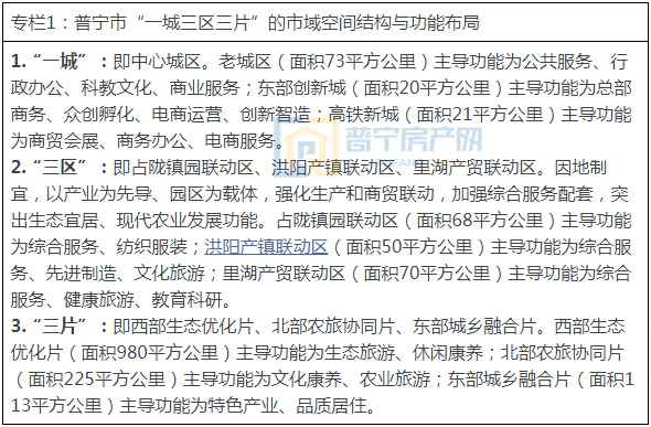2、“三区”:即占陇镇园联动区、洪阳产镇联动区、里湖产贸联动区。因地制宜,以产业为先导、园区为载体,强化生产和商贸联动,加强综合服务配套,突出生态宜居、现代农业发展功能。占陇镇园联动区(面积68平方公里)主导功能为综合服务、纺织服装;洪阳产镇联动区(面积50平方公里)主导功能为综合服务、先进制造、文化旅游;里湖产贸联动区(面积70平方公里)主导功能为综合服务、健康旅游、教育科研。
