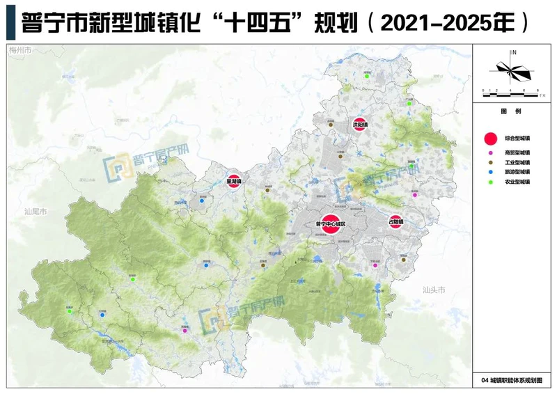 共划定综合性城镇4座(中心城区、占陇镇、里湖镇、洪阳镇)、商贸型城镇3个(南径镇、下架山镇、高埔镇)、工业型城镇5个(军埠镇、赤岗镇、梅塘镇、大坝镇、云落镇)、旅游型城镇3个(梅林镇、大坪镇、普侨镇)、农业型城镇5个(船埔镇、广太镇、麒麟镇、南溪镇、后溪乡)。