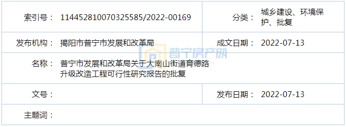 普宁市发展和改革局关于大南山街道育德路升级改造工程可行性研究报告的批复