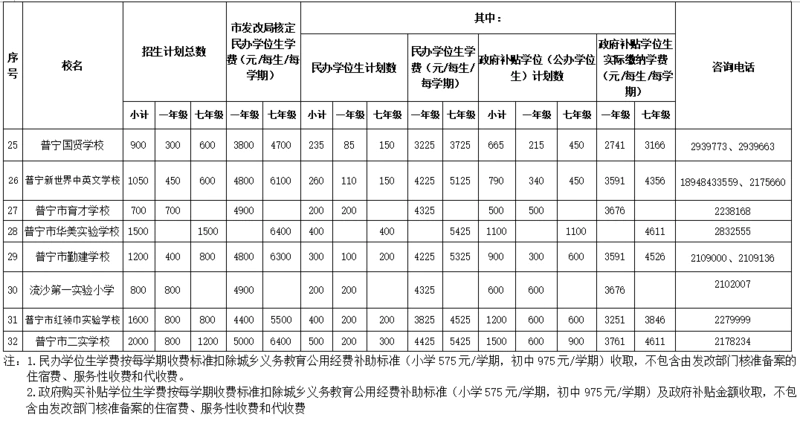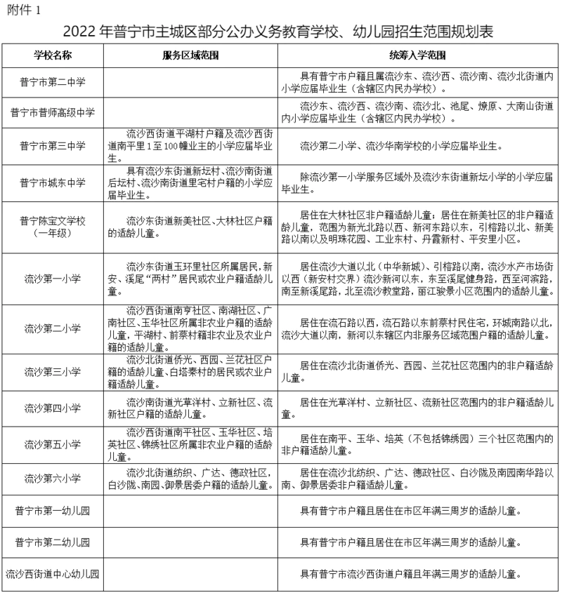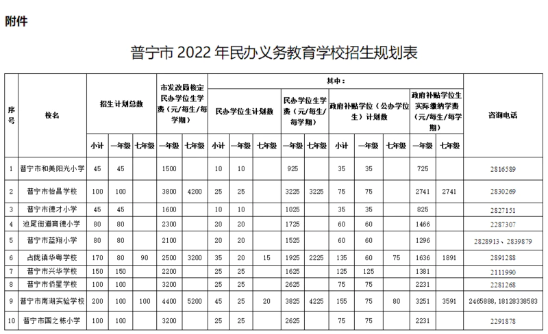 全市所有民办义务教育阶段学校只招收普宁市户籍及居住在普宁市内进城务工随迁人员的适龄儿童,不跨县区招生。各民办义务教育学校招生规划表详见《普宁市2022年民办义务教育学校招生规划表》