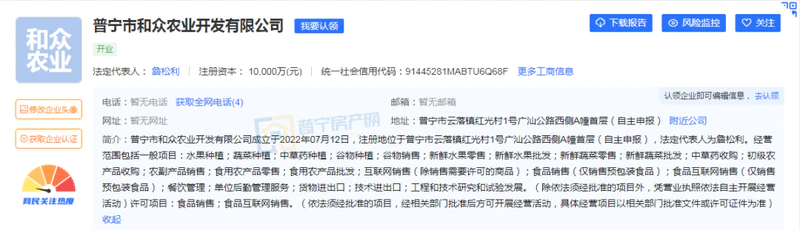 普宁市和众农业开发有限公司成立于2022年07月12日,注册地位于普宁市云落镇红光村1号广汕公路西侧A幢首层(自主申报)。经营范围包括一般项目:水果种植;蔬菜种植;中草药种植;谷物种植;谷物销售;新鲜水果零售;新鲜水果批发;新鲜蔬菜零售;新鲜蔬菜批发;中草药收购;初级农产品收购;农副产品销售;食用农产品零售;食用农产品批发;互联网销售(除销售需要许可的商品);食品销售(仅销售预包装食品);食品互联网销售(仅销售预包装食品);餐饮管理;单位后勤管理服务;货物进出口;技术进出口;工程和技术研究和试验发展。许可项目:食品销售;食品互联网销售。