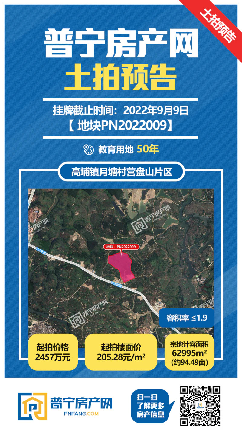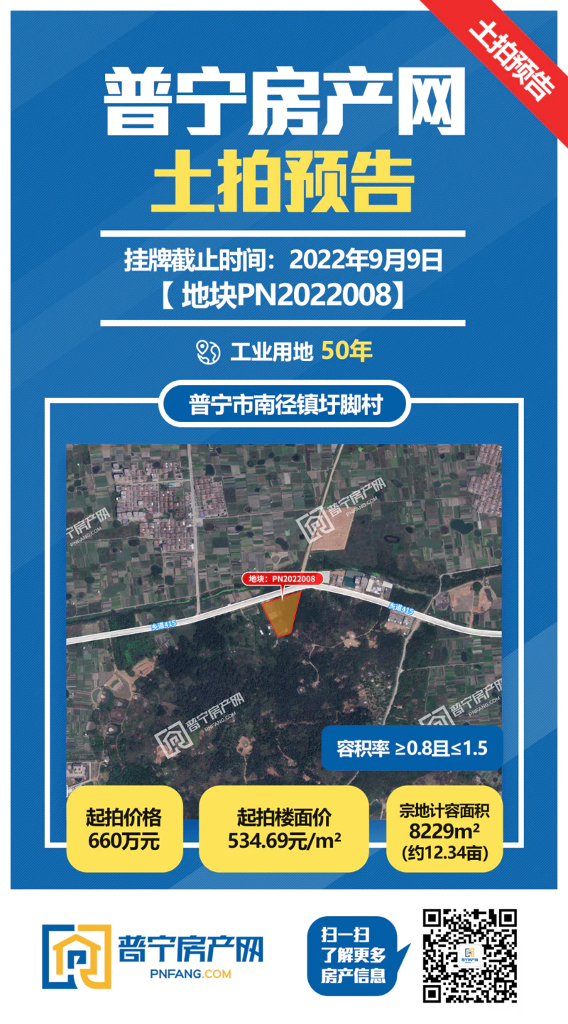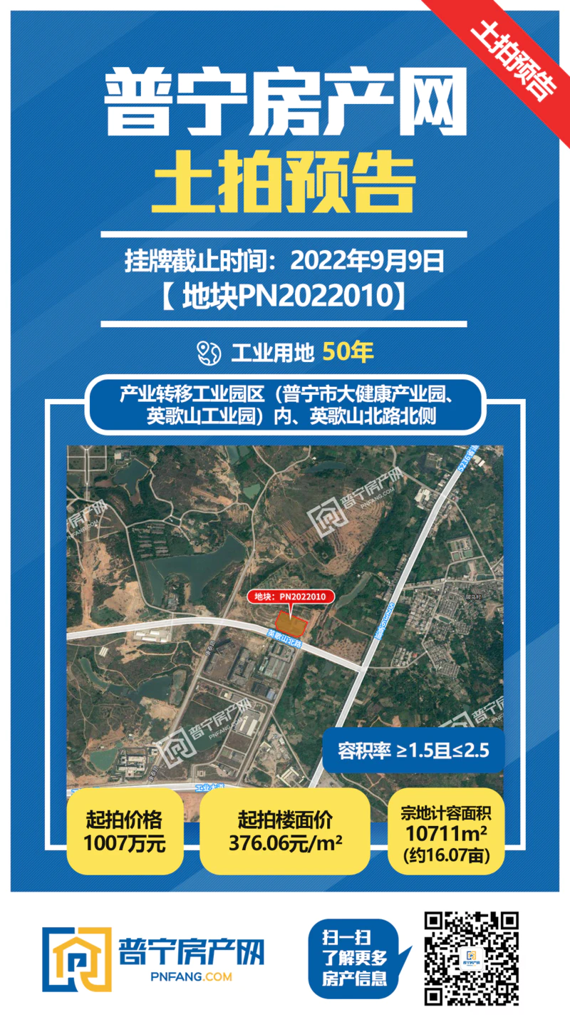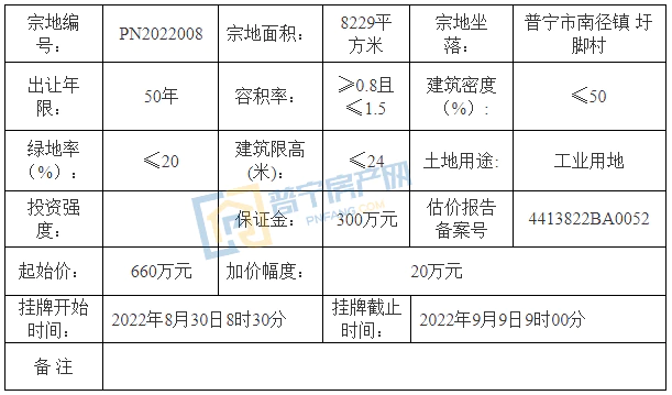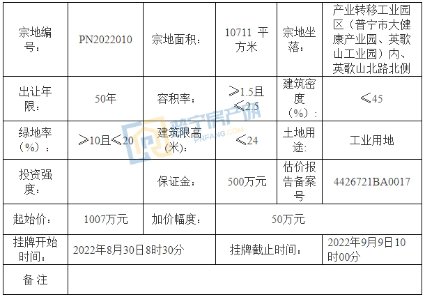 据了解,2022010地块拟引进“中药饮片生产基地”产业项目,竞买人在竞买前须与普宁市英歌山工业园管理委员会签订《投资协议书》、《普宁产业转移工业园项目投资承诺书》。项目建设须符合《揭阳市人民政府关于落实“三贡献一高一强”推动重点产业园区高质量发展的意见》、《普宁产业转移工业园招商引资若干措施》的相关要求,该宗地的项目投资规模≥5000万元,投资强度≥320万元/亩,建成投产后前二个完整会计年度亩均年产值≥200万元,亩均财税贡献≥10万元;投产后第三个完整会计年度起,亩均年产值≥300万元,亩均财税贡献≥18万元。2022010地块竞得人于成交之日起3个工作日内和普宁市英歌山工业园管理委员会签订《宗地建设使用监管协议书》,凭《宗地建设使用监管协议书》于成交之日起5个工作日内与揭阳市公共资源交易中心签订成交确认书。