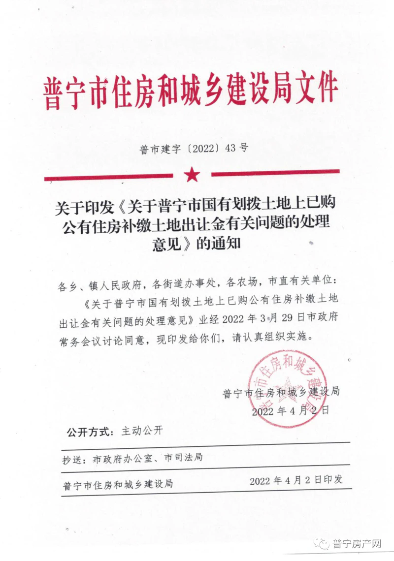 近日,《关于普宁市国有划拨土地上已购公有住房补缴土地出让金有关问题的处理意见》业经2022年3月29日市政府常务会议讨论同意,正式印发。