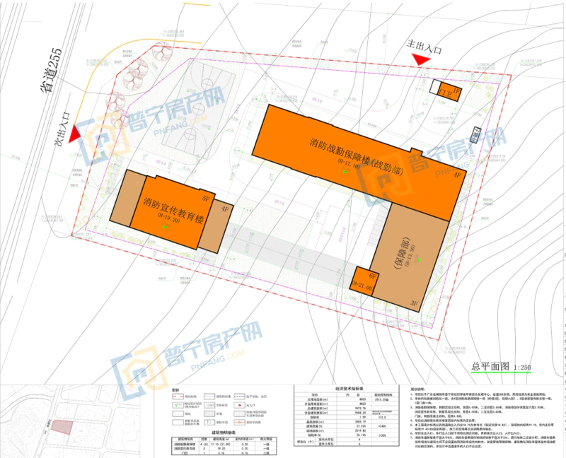 建筑规模:壹幢肆层消防战勤保障楼(附楼叁层,局部陆层)、壹幢伍层消防宣传教育楼、壹幢壹层门房,总建筑面积玖仟肆佰柒拾叁平方米。