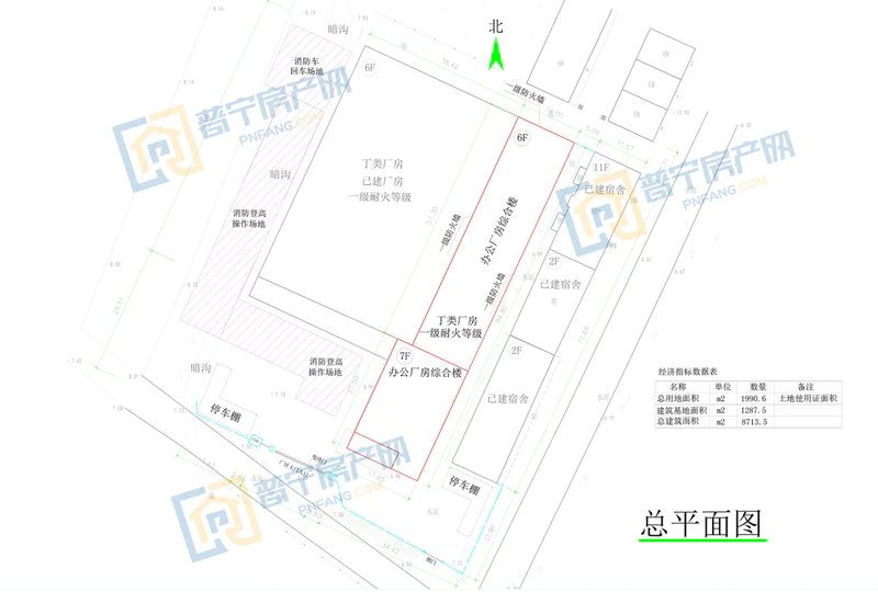 5. 建设规模:3幢1至4层厂房、2幢6层综合楼、1幢2层配电房、门房及地下消防泵房、地下消防水池,总建筑面积56238.35 ㎡。