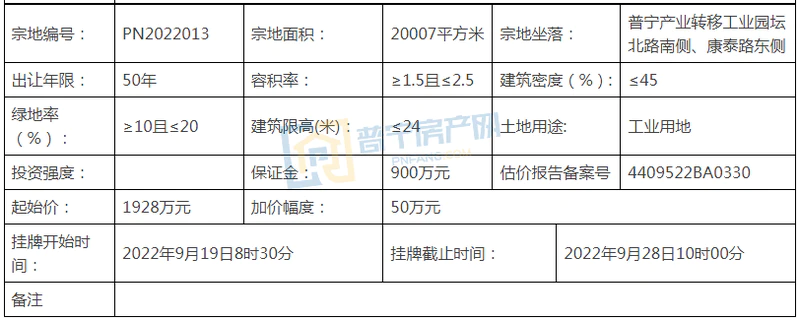2022013地块项目须符合《揭阳市人民政府关于落实“三贡献一高一强”推动重点产业园区高质量发展的意见》、《普宁产业转移工业园招商引资若干措施》和园区产业规划的相关要求,该宗地的项目投资规模≥5000万元,投资强度≥320万元/亩,建成投产后前二个完整会计年度亩均年产值≥200万元,亩均财税贡献≥10万元;投产后第三个完整会计年度起,亩均年产值≥300万元,亩均财税贡献≥18万元。2022013地块竞得人于成交之日起3个工作日内取得广东普宁产业转移工业园入园审核意见,并与普宁产业转移工业园管委会签订《投资协议书》、《普宁产业转移工业园项目投资承诺书》和《宗地建设使用监管协议书》,凭《宗地建设使用监管协议书》于成交之日起5个工作日内与揭阳市公共资源交易中心签订成交确认书。竞得人未能签订协议书的,不得签订《成交确认书》,竞得人不按规定期限签订《成交确认书》的,该竞买行为自动撤销,保证金作为违约金上缴国库,不予退还。