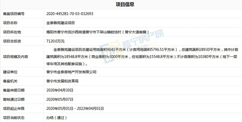 普宁市金泰房地产开发有限公司于2018年7月受让位于普宁市下架山镇蛟池村(普宁大道南侧)地块的国有建设用地使用权,用地面积为13.56亩,土地用途为其他普通商品住房用地。根据普宁市金泰房地产开发有限公司与我局签订的《国有建设用地使用权出让合同》(合同编号445281-2018-000031)的约定,该用地动工时间为2019年7月20日之前。