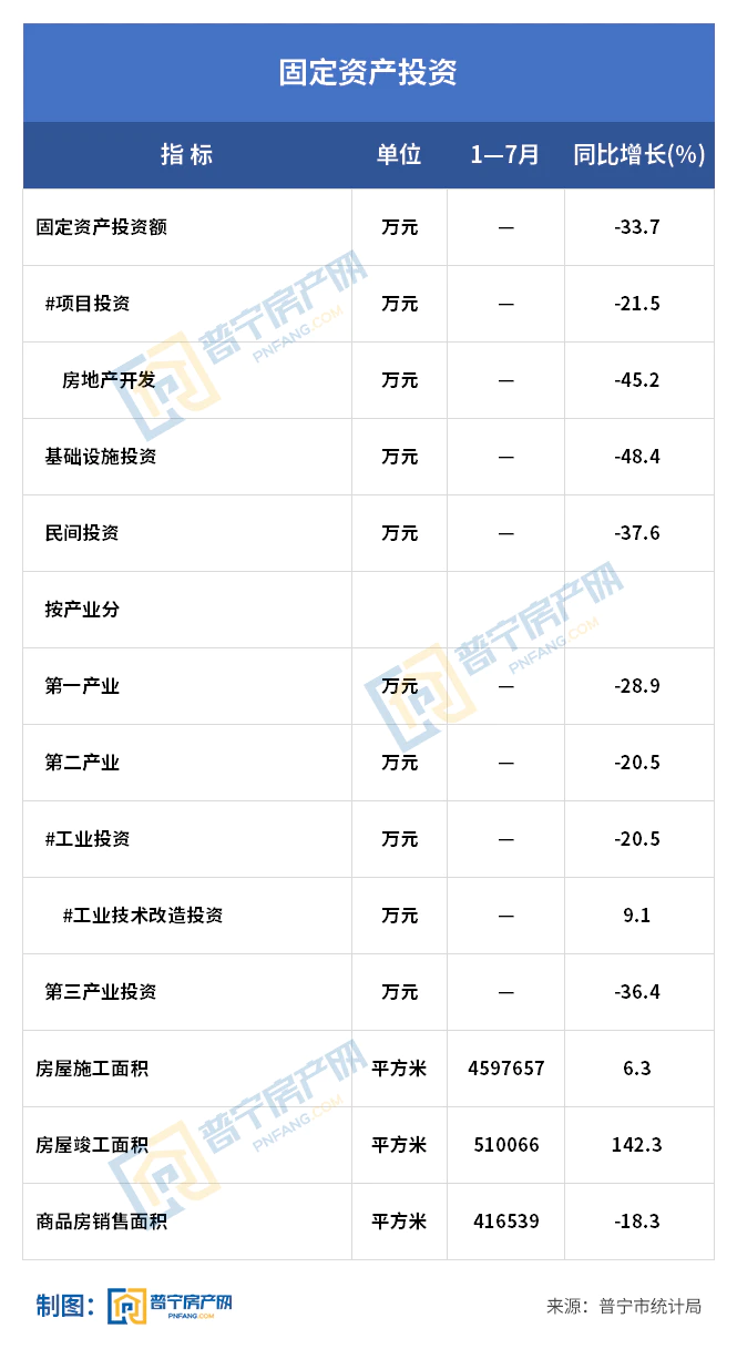 1-7月,全市固定资产投资下降33.7%。其中,项目投资下降21.5%;房地产开发投资下降45.2%。
