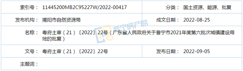 《揭阳市自然资源局关于审批普宁市2021年度第六批次城镇建设用地的请示》(揭市自然资地审报〔2022〕40号)及相关材料已通过审核。根据《中华人民共和国土地管理法》第四十四、四十五条以及《广东省土地管理条例》第二十四条的有关规定,批复如下: