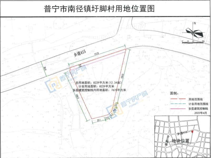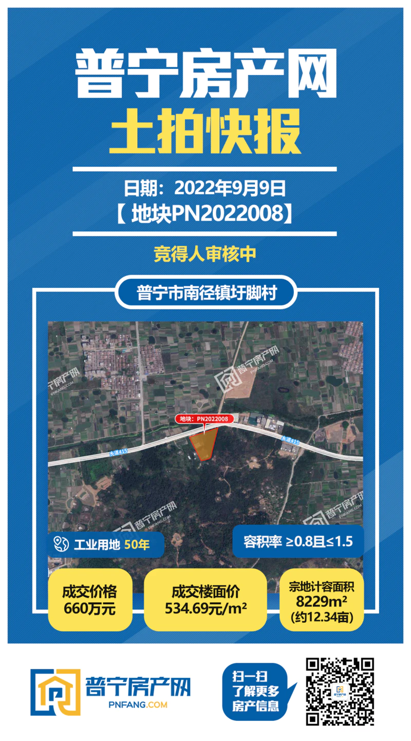 PN2022008地块位于普宁市南径镇圩脚村,占地面积8229平方米,以660万成功出让,成交楼面价534.69元/㎡,为50年工业用地。