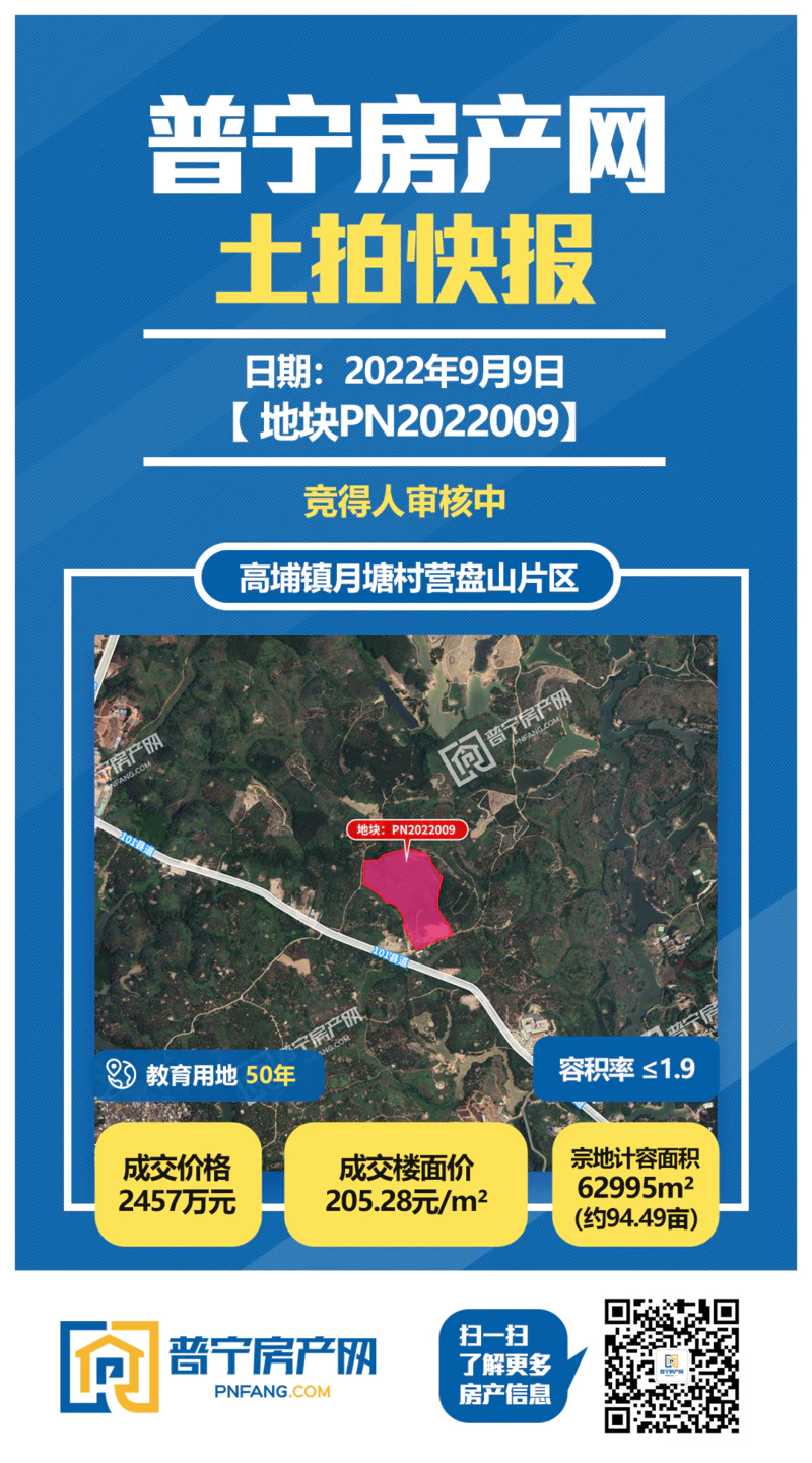 PN2022009地块位于高埔镇月塘村营盘山片区,占地面积62995平方米,以2457万成功出让,成交楼面价205.28元/㎡,为50年教育用地。
