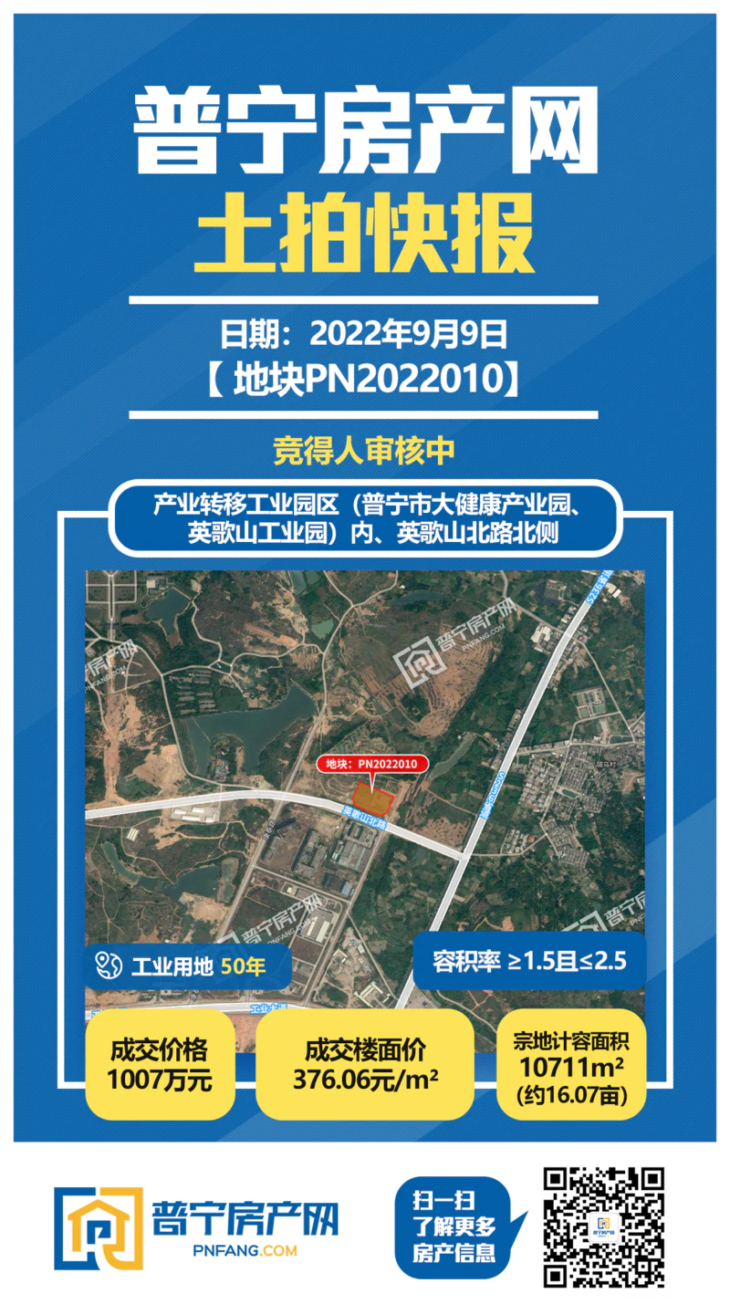 PN2022010地块位于产业转移工业园区(普宁市大健康产业园、英歌山工业园)内,英歌山北路北侧,占地面积10711平方米,以1007万成功出让,成交楼面价376.06元/㎡,为50年工业用地。