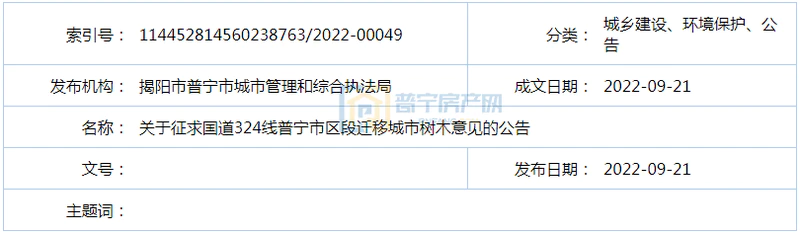 关于征求国道324线普宁市区段迁移城市树木意见的公告