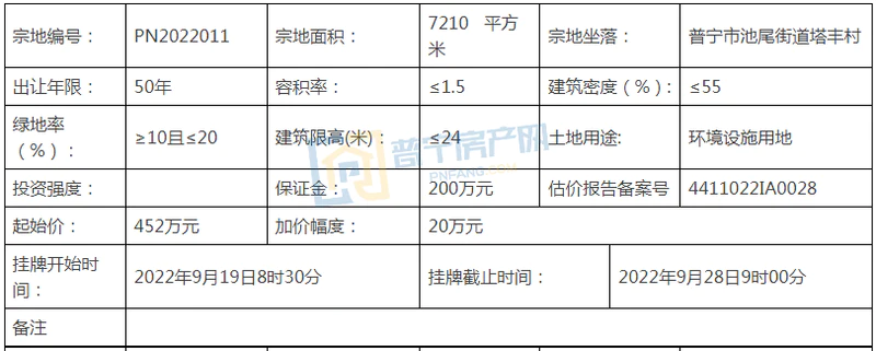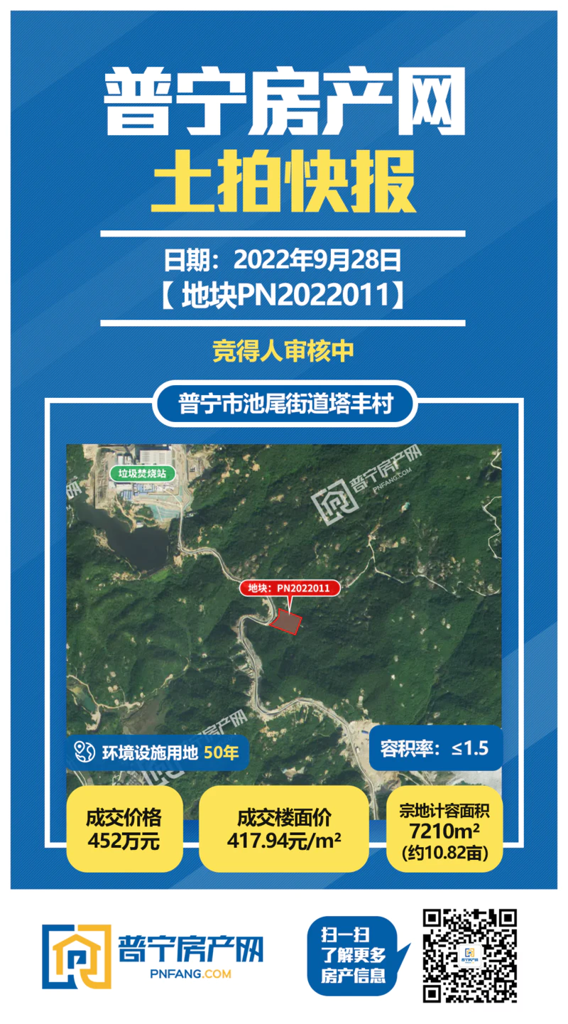 PN2022011地块位于普宁市池尾(楼盘详情户型图相册地图)街道塔丰村,占地面积7210平方米,以452万元成功出让,成交楼面价417.94元/㎡,为50年环境设施用地。