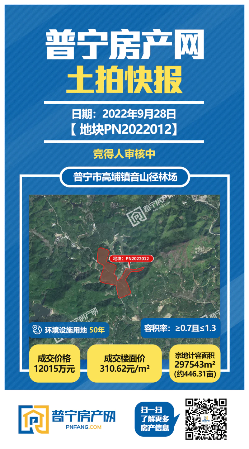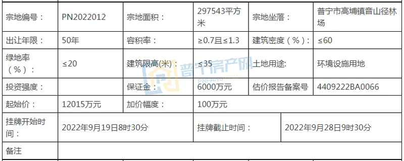 PN2022012地块位于普宁市高埔镇音山径林场,占地面积297543平方米,以12015万元成功出让,成交楼面价310.62元/㎡,为50年环境设施用地。