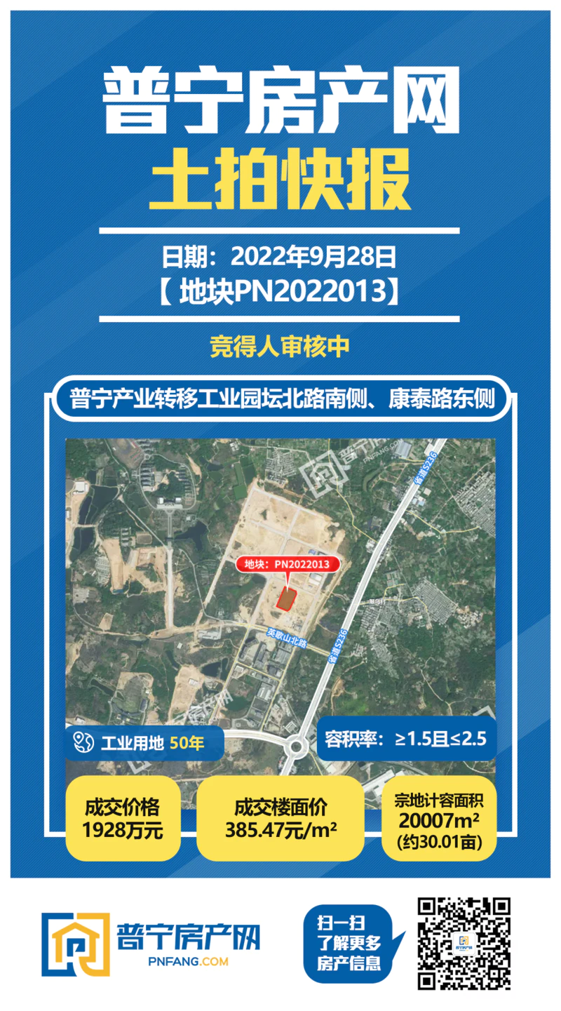 PN2022013地块位于普宁产业转移工业园坛北路南侧、康泰路东侧,占地面积20007平方米,以1928万元成功出让,成交楼面价385.47元/㎡,为50年工业用地。