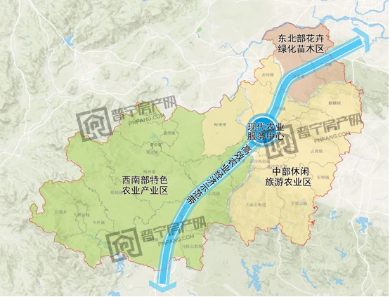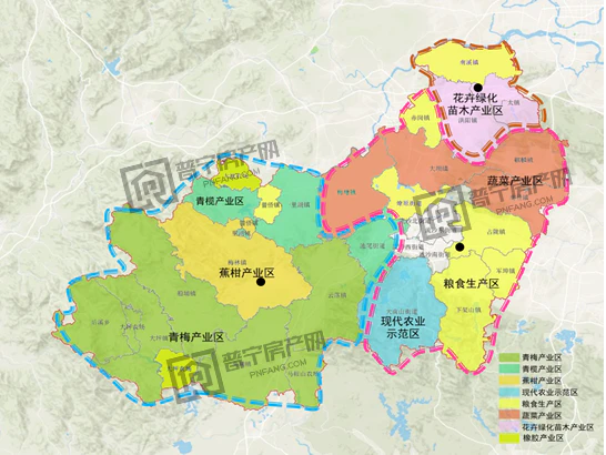 立足农业种植优势条件,以特色化、规模化、品牌化农业种植为引领,划分西南部林果产业、中部粮食蔬菜、东北部花卉绿化苗木三大特色农业集聚区。大力发展精细农业,以精细化种植为主线,在各特色农业集聚区的基础上,形成青梅产业区、青榄产业区、蕉柑产业区、蔬菜产业区、花卉绿化苗木产业区、粮食生产区和现代农业示范区、橡胶产业区等一系列精细化农业种植分区。