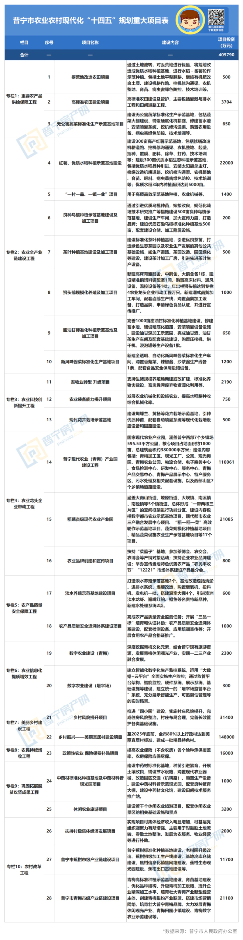 近日,普宁市人民政府发布了关于印发普宁市农业农村现代化“十四五”规划的通知。据了解,“十四五”期间,我市规划建设重点项目28项,总投资40.579亿元,涉及基础设施建设、农林和水利等领域。因篇幅较长,小房君整理了重点内容如下: