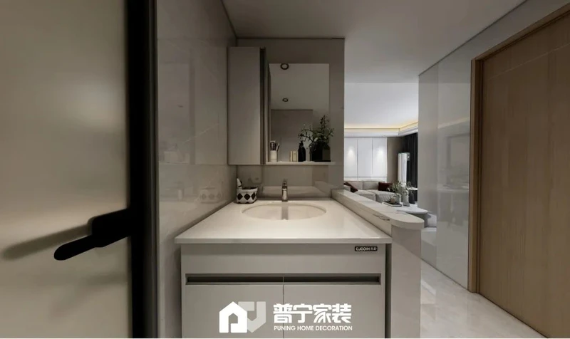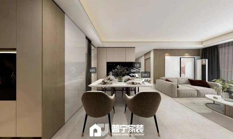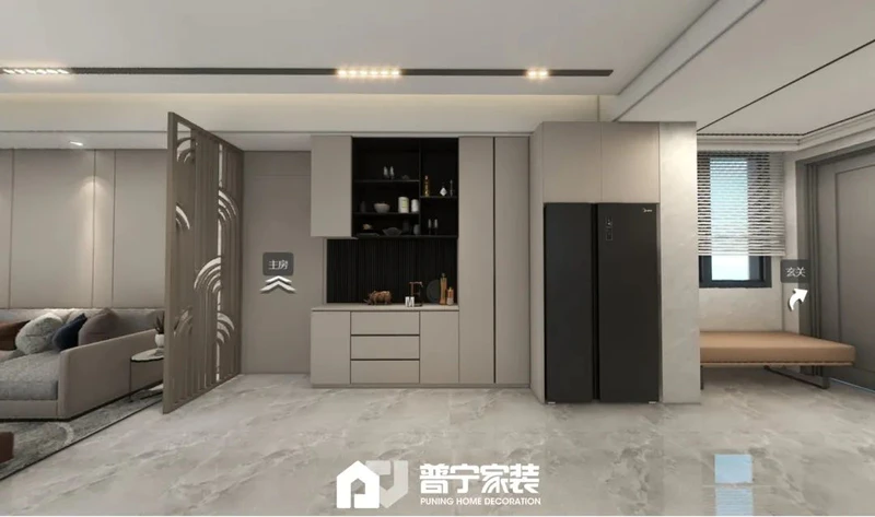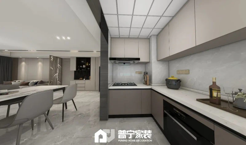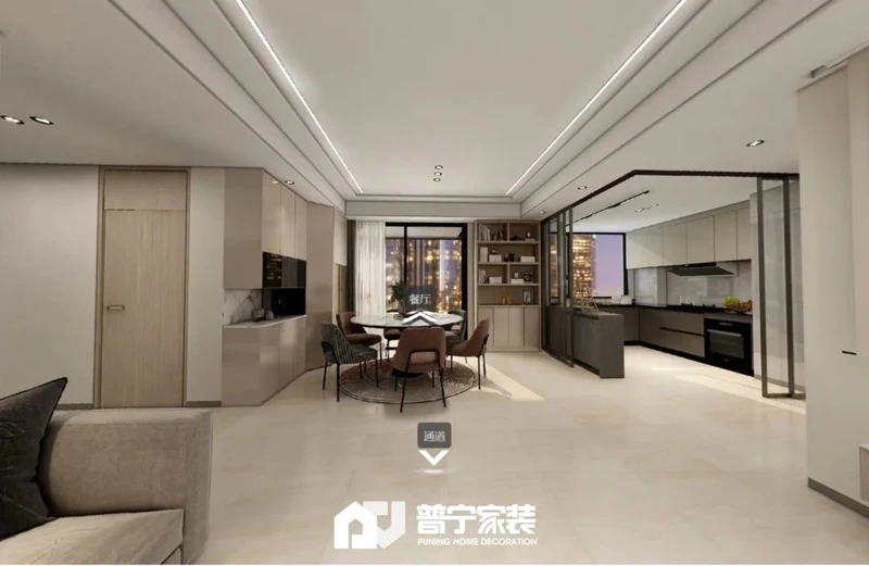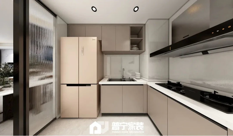 户型改动:厨房做无立柱转角推拉,整体设计弱化了通道过于狭长问题,同时使得整个客餐厅空间更加宽阔,厨房空间更加灵动。