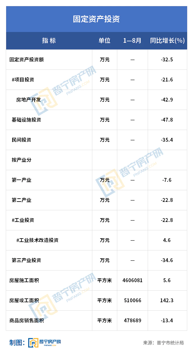 1-8月,全市固定资产投资下降32.5%。其中,项目投资下降21.6%;房地产开发投资下降42.9%。