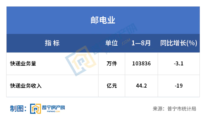 1-8月,全市实现社会消费品零售总额208.73亿元,增长1.9%。全市电子商务交易额492.43亿元,增长0.1%,快递业务量10.38亿件,下降3.1%,快递业务收入44.20亿元,下降19.0%。