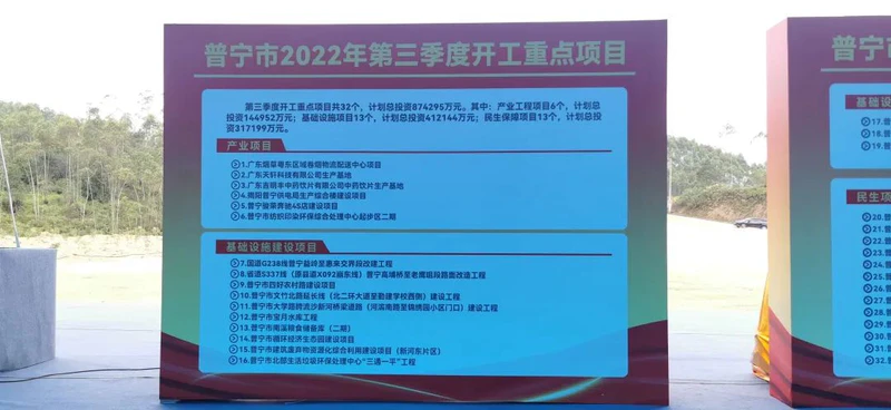据了解,普宁市2022年第三季度开工重点项目共32个,计划总投资874295万元,涵盖基础设施、产业工程、民生保障等多个领域,将为普宁加快高质量发展注入新的活力。其中:产业工程项目6个,计划总投资144952万元;基础设施项目13个,计划总投资412144万元;民生保障项目13个,计划总投资317199万元。