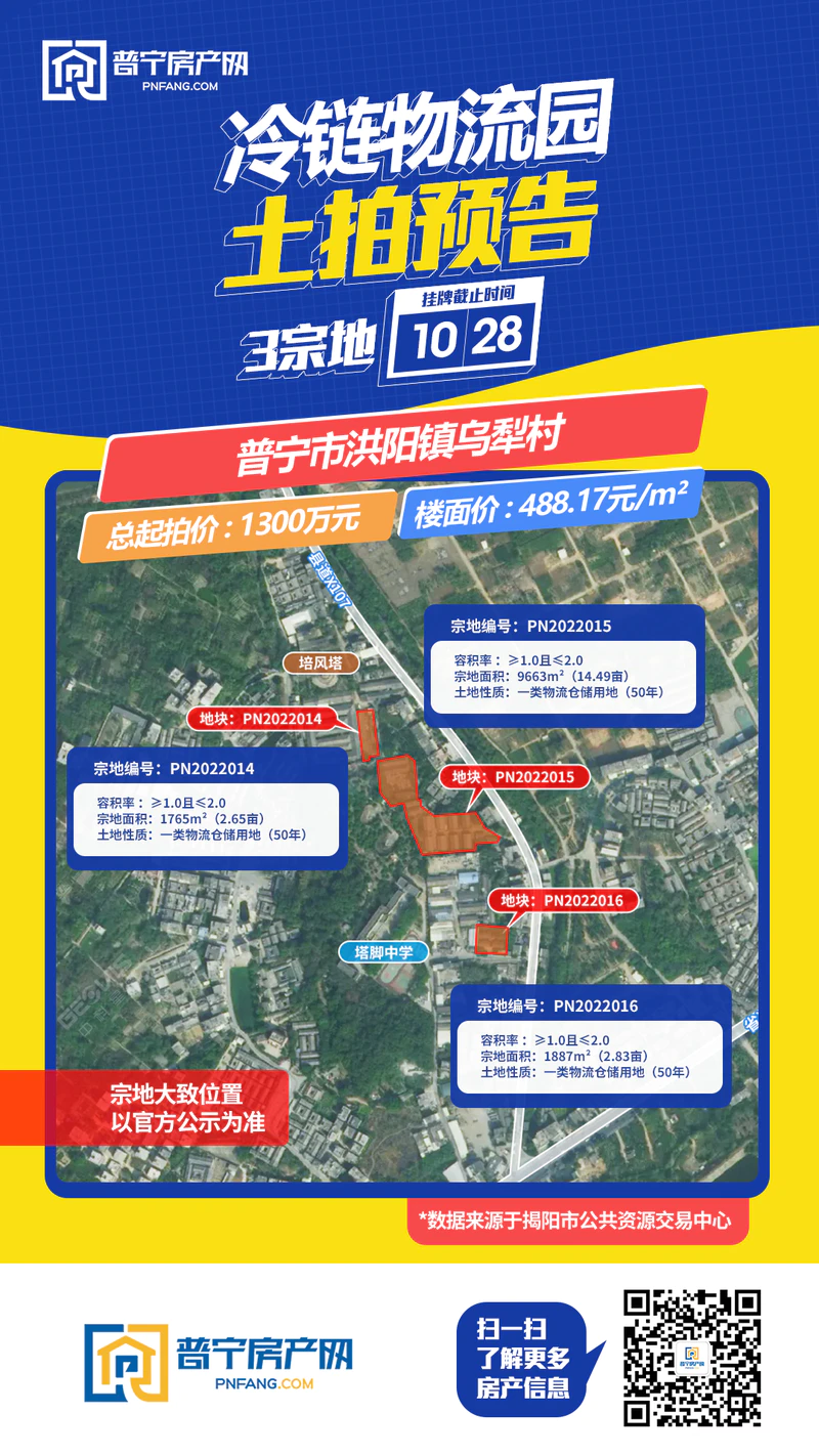 9月的土拍刚落下帷幕,10月的土拍又来了!今天,普宁市自然资源局以网上挂牌方式出让普宁冷链物流园规划单元组合(包含3宗地)的国有建设用地使用权,将于10月28日开拍。这是首次实行“带方案”组合出让,拟作为普宁冷链物流园项目(仅用于公共型农产品冷链物流中心及配套设施建设),三地块均为一类物流仓储用地,合计出让面积13315平方米(约20亩),起始价1300万,一起来了解下: