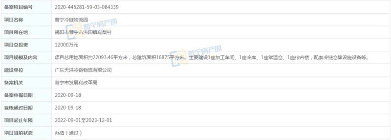 今年6月,普宁市洪阳镇人民政府对普宁冷链物流园控制性详细规划(草案)进行公示,将补齐我市冷链仓储供应保障短板,规划总面积为108亩,项目的建设将带动该片区公共配套设施提质增效,创造宜居环境,打造居住、生产、休闲等要素协调发展的环境风貌。