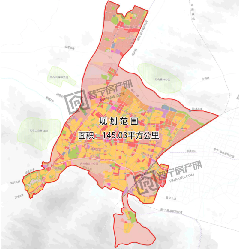 西至揭普高速,东至厦深铁路及高铁起步区范围,北至汕湛高速及英歌山工业园范围,南至大南山(楼盘详情户型图相册地图)城市公园及南方梅园(楼盘详情户型图相册地图),规划总面积为145.03平方公里。