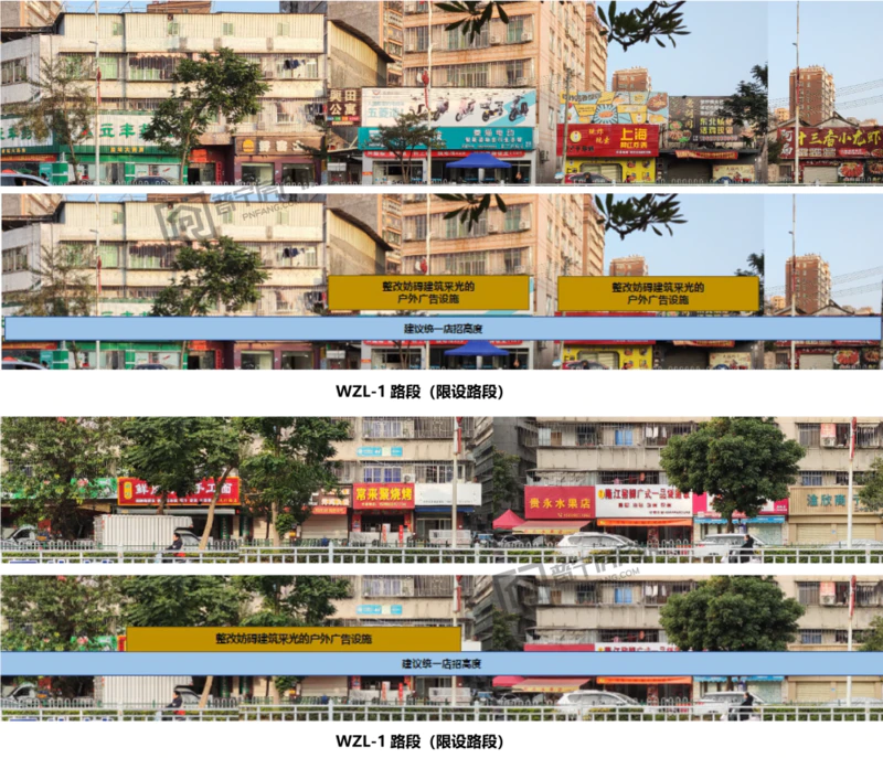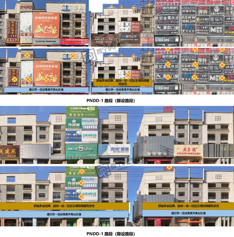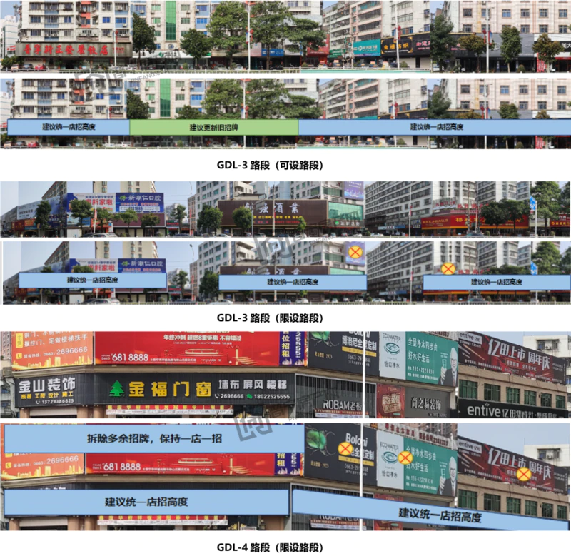 部分路段整改建议:建议统一店招高度并亮化处理,拆除多余招牌,保持一店一招且不得妨碍建筑采光。