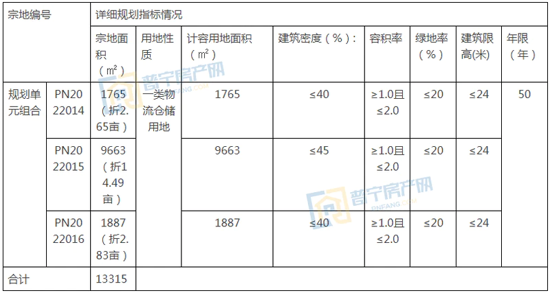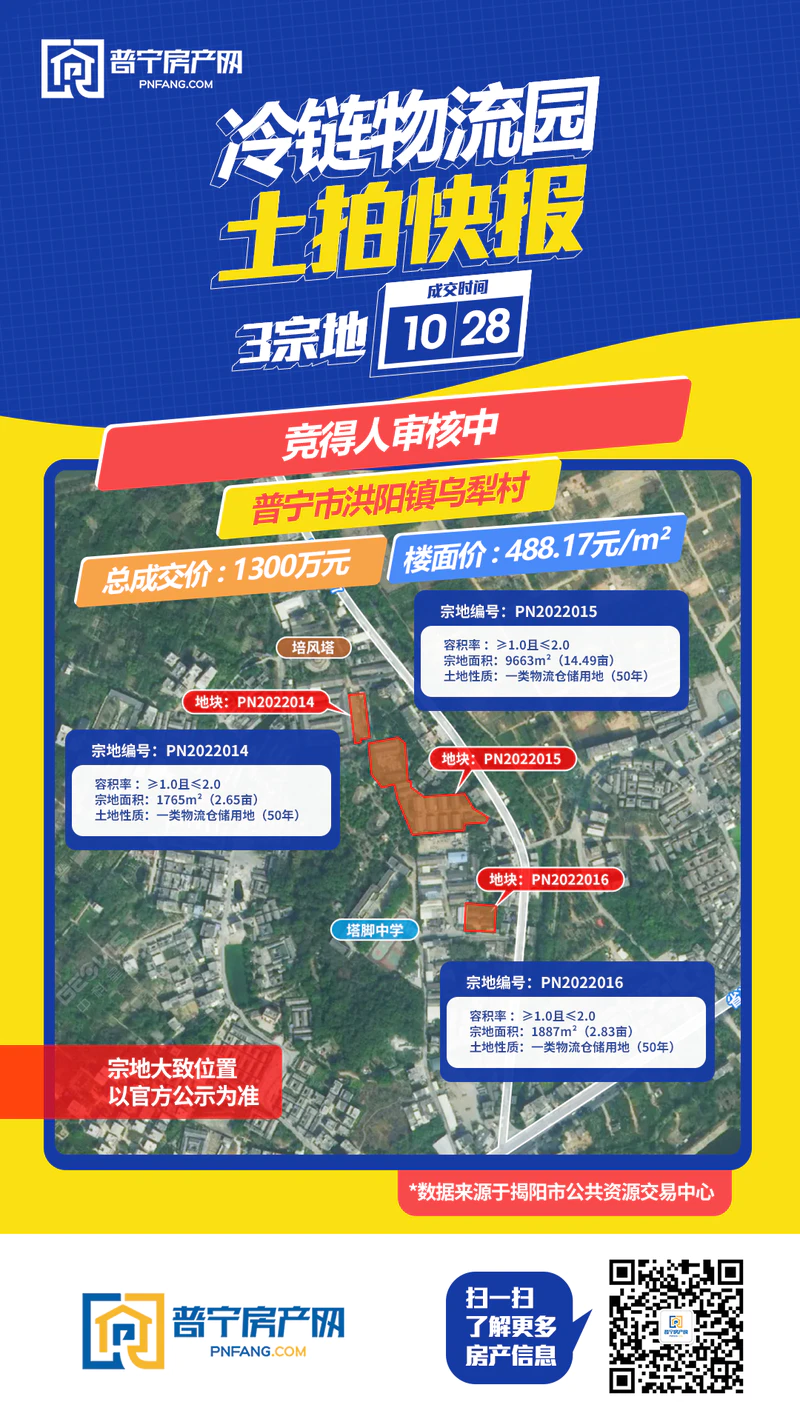 拟出让规划单元组合(PN2022014、PN2022015、PN2022016)位于普宁市洪阳镇乌犁村,交通十分便捷,开发条件成熟。最终以底价1300万成功出让,成交楼面价488.17元/㎡。其中PN2022014地块占地面积1765㎡(折2.65亩),PN2022015地块占地面积9663㎡(折14.49亩),PN2022016地块占地面积1887㎡(折2.83亩),均为50年一类物流仓储用地。