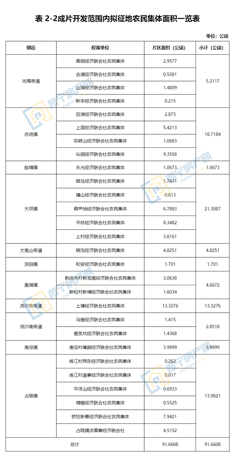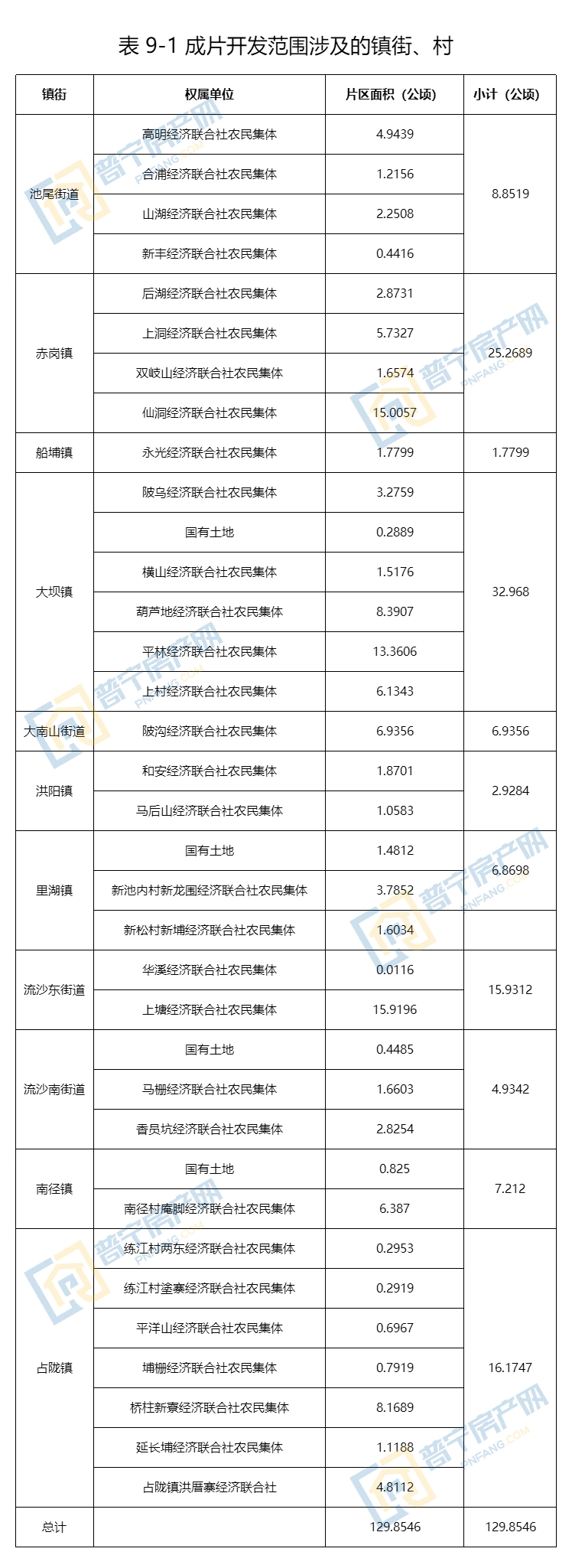 本次土地征收成片开发范围总面积129.8546公顷,拟征收范围面积91.6608公顷,详请见下表。