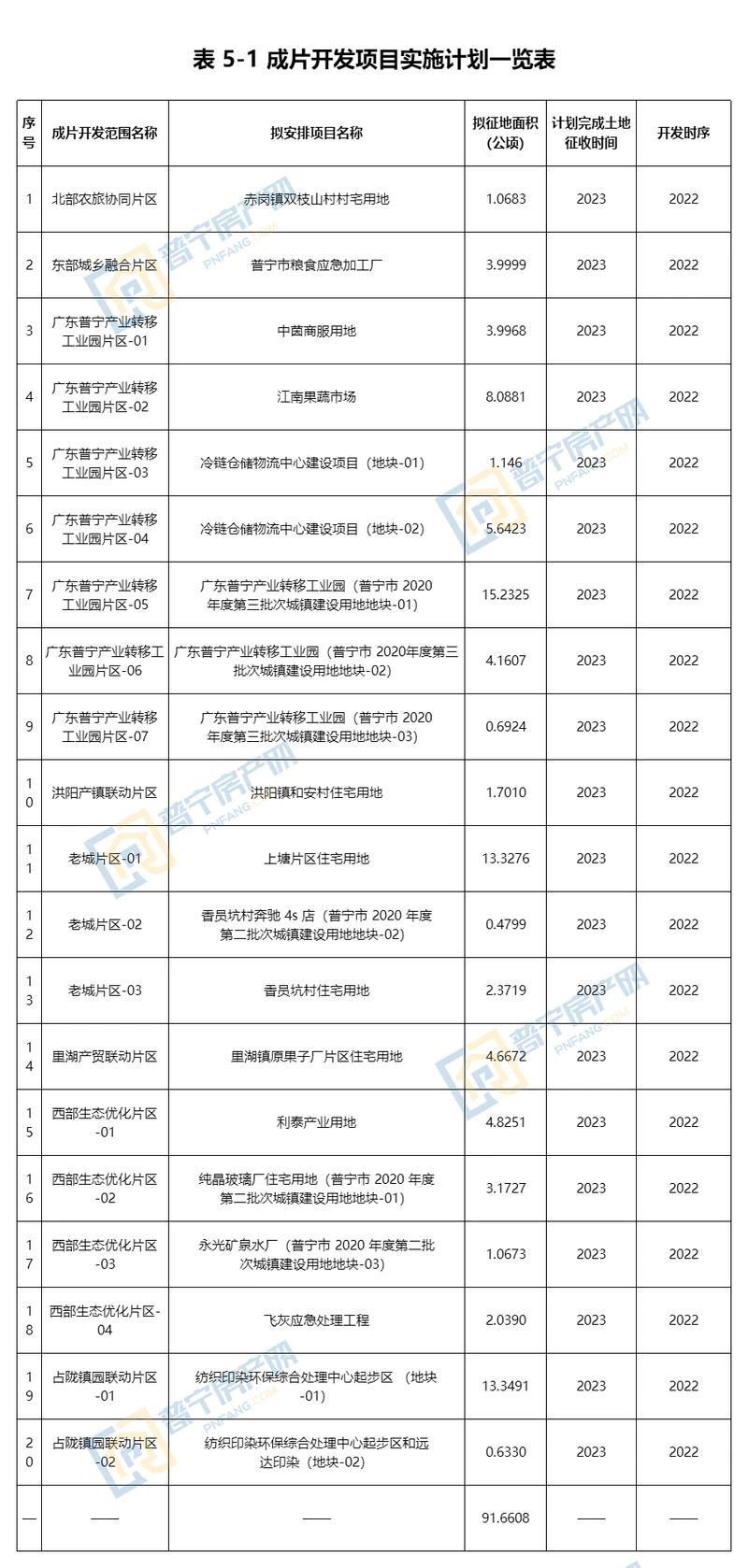 今天,普宁市自然资源局发布了普宁市2022年度土地征收成片开发方案(公示草案),据小房君了解,本方案拟实行土地征收成片开发范围总面积129.8546公顷(1947.819亩),其中拟征收范围面积91.6608公顷(1374.912 亩),征地面积占成片开发总面积的70.59%。成片开发范围共包含20个片区,拟建的项目用地开发时序为2年(即2022年至2023年),具体内容如下: