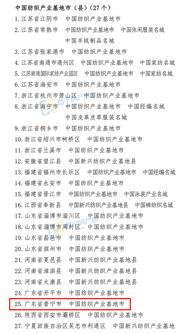 普宁市“中国纺织产业基地市”称号顺利通过复查,确认为全国纺织产业集群试点地区;