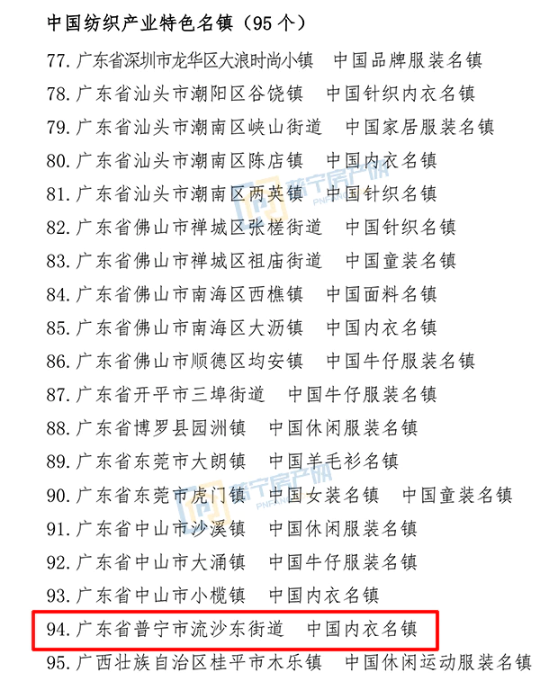 普宁市流沙东街道以“中国内衣名镇”入围“中国纺织产业特色名镇”;