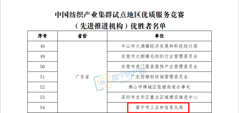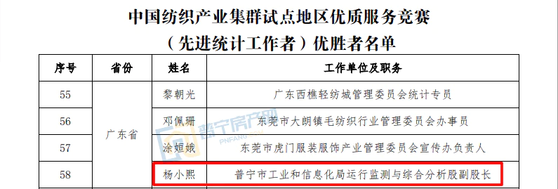普宁市工业和信息化局入围“中国纺织产业集群试点地区(先进机构)”,该局运行监测与综合分析股副股长杨小熙荣获中国纺织产业集群试点地区优秀服务竞赛先进统计工作者;