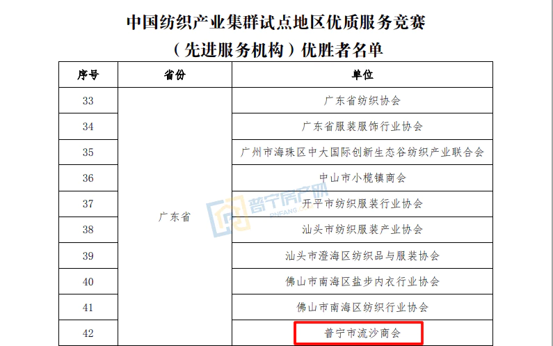 普宁市流沙商会入围“中国纺织产业集群试点地区(先进服务机构)”。