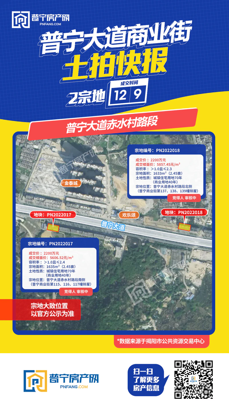 PN2022018地块位于普宁大道赤水村路段北侧(普宁商业街第137、138、139幢排屋),占地面积1633平方米,以2200万成功出让,成交楼面价5857.45元/㎡,为70年城镇住宅用地兼容40年商业用地。