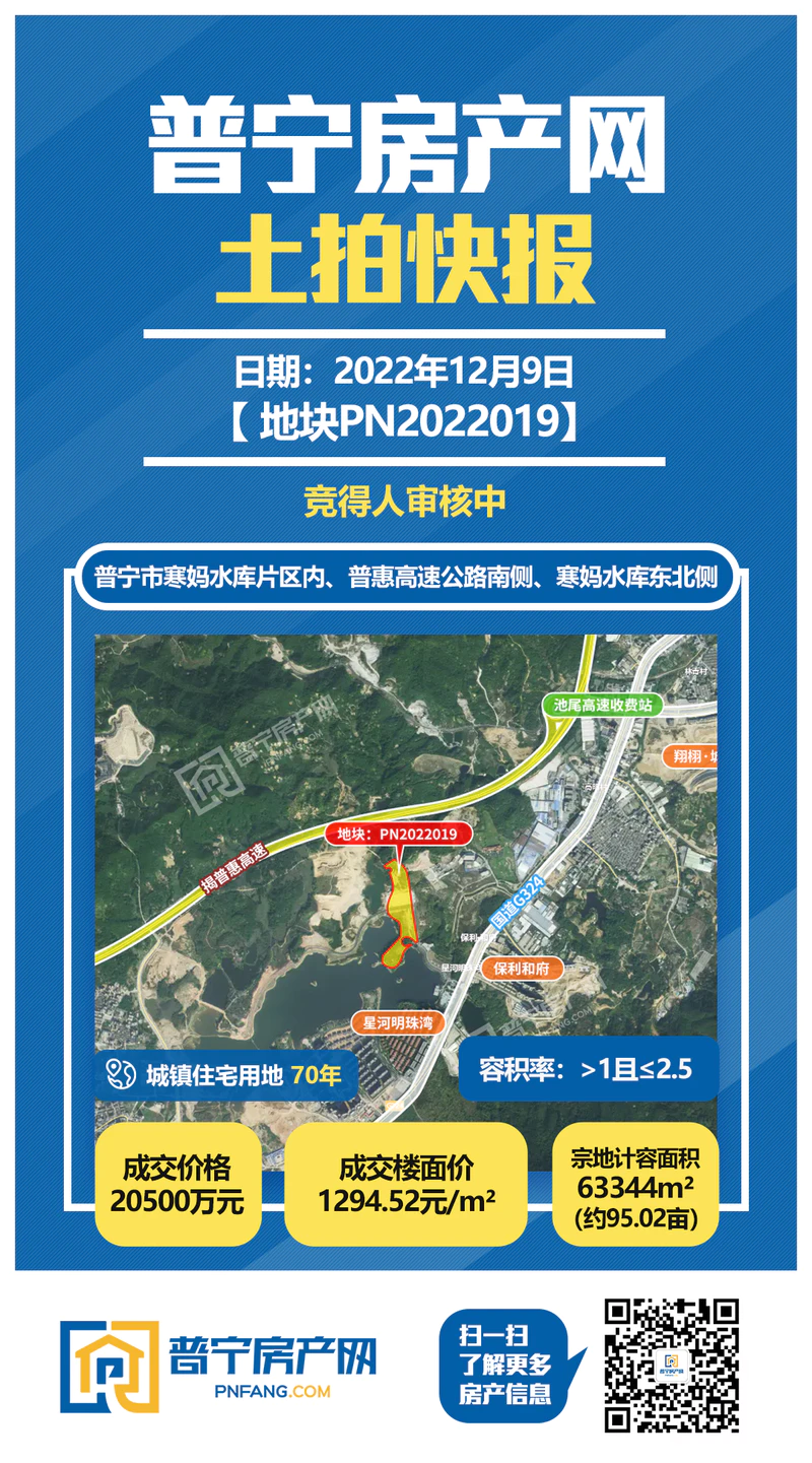PN2022019地块位于普宁市寒妈水库片区内、普惠高速公路南侧、寒妈水库东北侧,占地面积63344平方米,以20500万成功出让,成交楼面价1294.52元/㎡,为70年城镇住宅用地。
